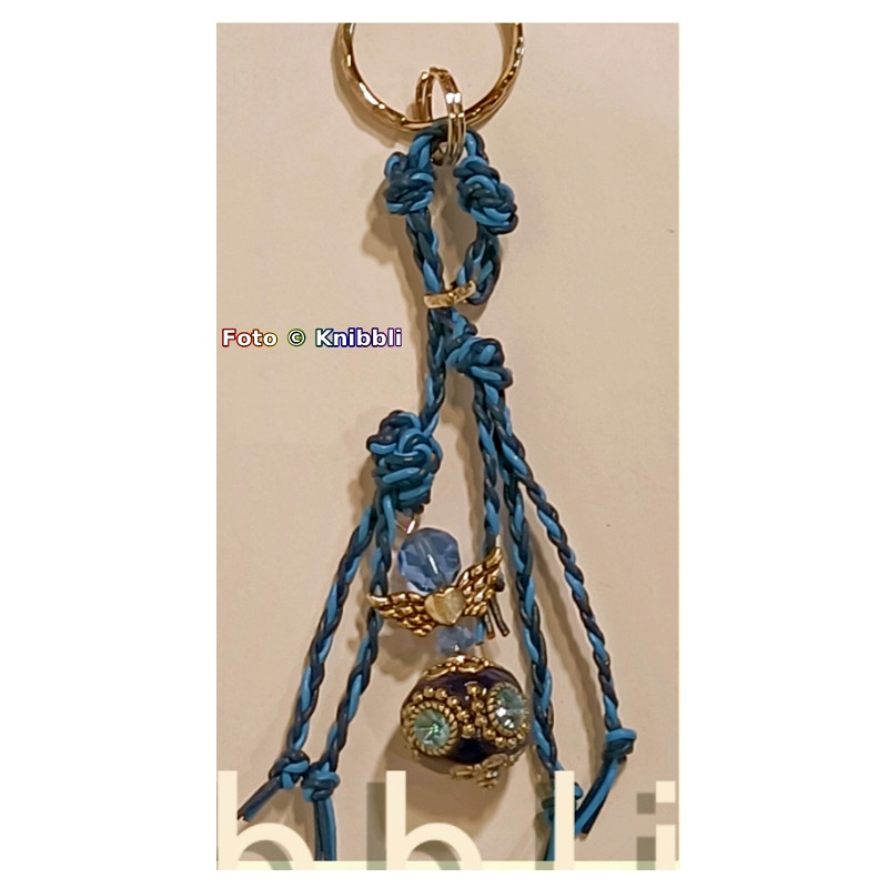 Er ist mit blauen, geflochtenen Lederbändern und dekorativen Schmuckelement eines Glücksengel mit großer Kashmiri Perle gestaltet.