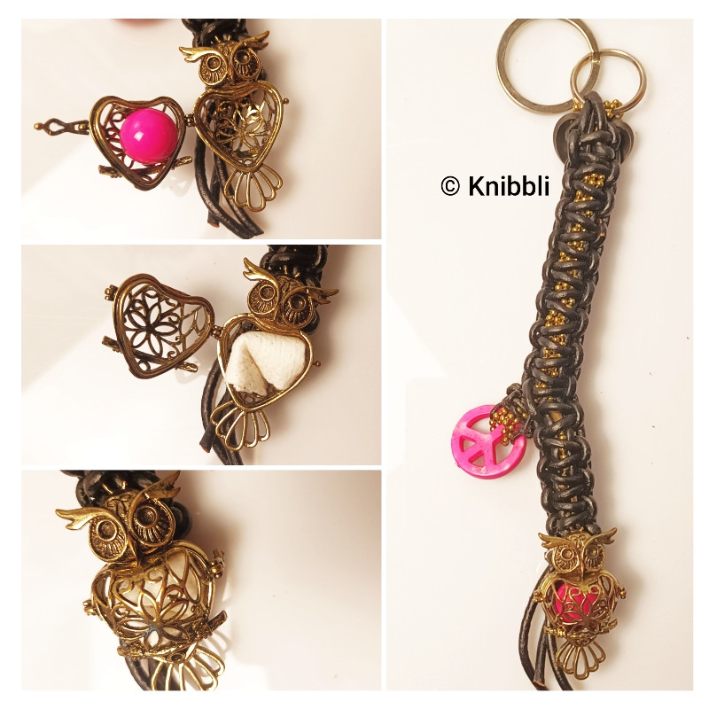 Symbolik: Der Anhänger ist mit einer Metall-Eule geschmückt, wobei der herzförmige Rumpf sich öffnen lässt. Sie steht als Symbol für Weisheit und Schutz. Hinzu kommt das Friedenssymbol in leuchtendem Fuchsia-Pink – ein modernes Statement für Harmonie und Freiheit.